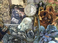 but i have done this lovely canvas using some of new flowers. lots of lays , had great fun applying all the layer as with the collection of odd bits. there is a love steam punk design photo ,some altered clay charoltte dolls and awhole lot of other wonders.